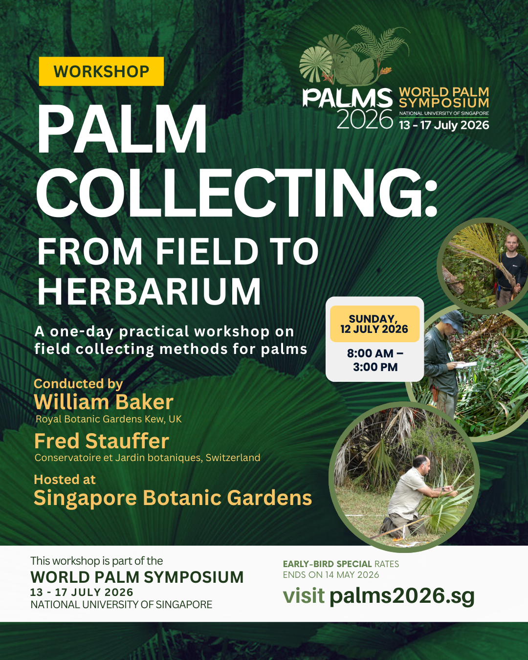 This workshop combines theoretical knowledge on palm collecting, pressing and botanical description with practical activities outdoors. Benefiting from the rich living palm collection of the Singapore Botanical Garden, techniques for recording and collecting all key groups of palms will be covered, with participants being introduced to representatives of all five subfamilies in the living state.